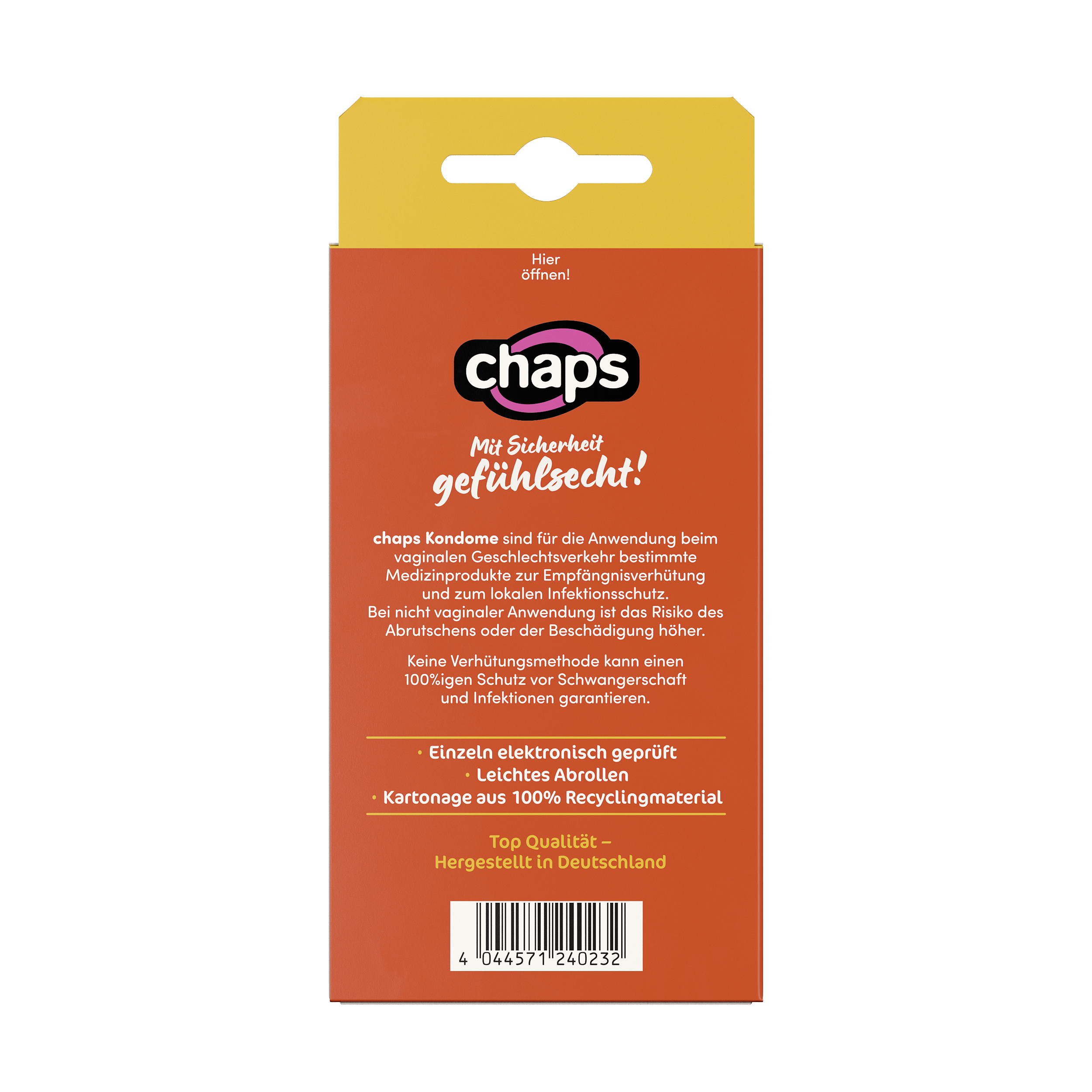 24er Chaps Fruit & Fun Kondome - Sortenmix: Erdbeer-, Tutti-Frutti-, Bananen- & Orangen-Aroma - farbig & gefühlsecht - Made in Germany